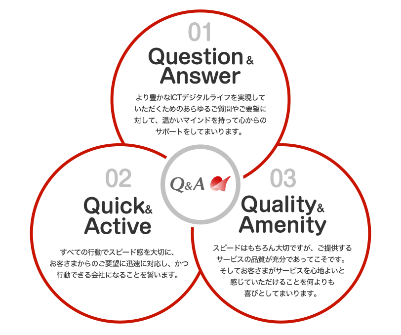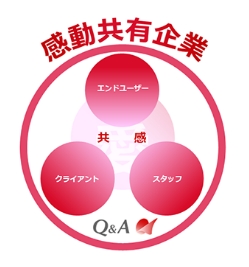 キューアンドエーは、新たな価値を生み出すチャレンジ機会を創出し、すべての従業員がお客さまに寄り添いながら自ら考え行動することで、最高品質のサービス(感動のサービス)をお届けし、お客さまと感動を分かち合い共に成長する企業を目指します。