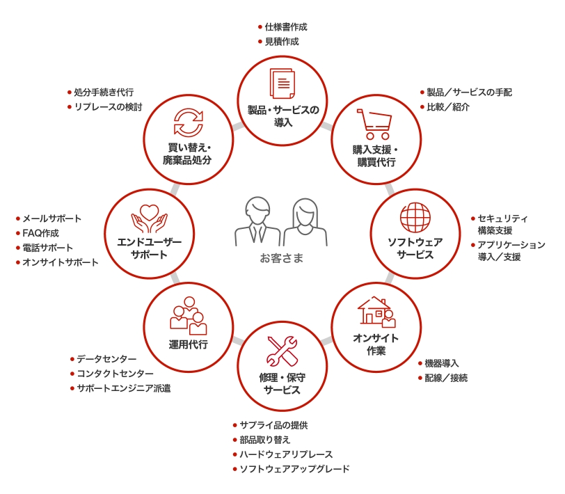 電話サポート、メールサポートに始まり、フィールドサポートからマーケティングサポートまで、お客さまの要望をワンストップで叶えます。また、サービス品質を第一に捉え、当社独自のシステムを導入し情報漏洩の防止を徹底しています。