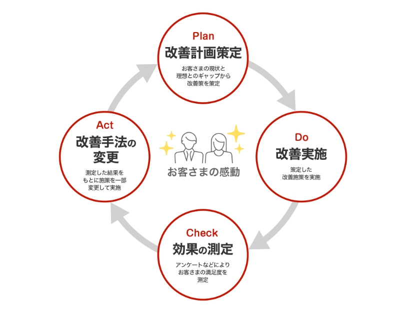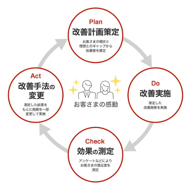 当社には、「改善計画策定」→「改善実施」→「効果の測定」→「改善手法の変更」というPDCAサイクルがあります。お客さまの要望と現状を比較分析し、改善策を立案し施行。このプロセスを繰り返し、高い品質と速い対応を実現します。