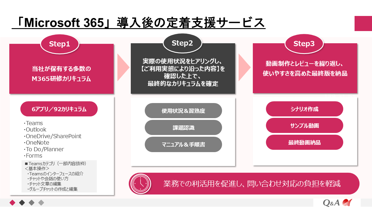 【Step1】キューアンドエーが保有する多数の M365 研修コンテンツの中から、実用的な内容の構成をピックアップします。