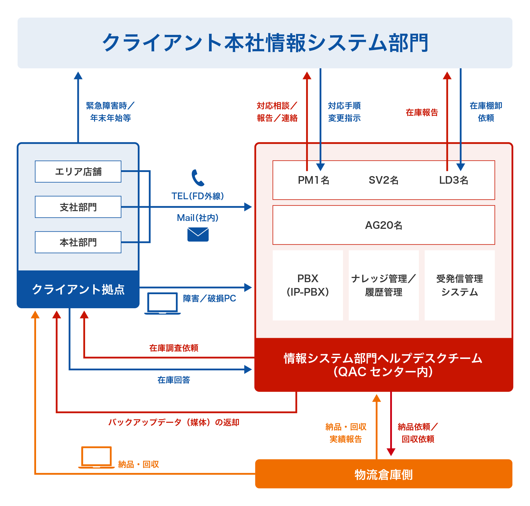 従業員が業務で使用しているパソコン・プリンタ・タブレットなどについての、操作案内およびトラブルシューティングを行う窓口を請け負い、情報システム部所属の社内ヘルプデスクとして、電話やリモート操作、メール、チャットを使用してお問合せに対応したことで、情報システム部門の効率化を実現すると共に支社支店の従業員の業務効率を劇的に改善いたしました。