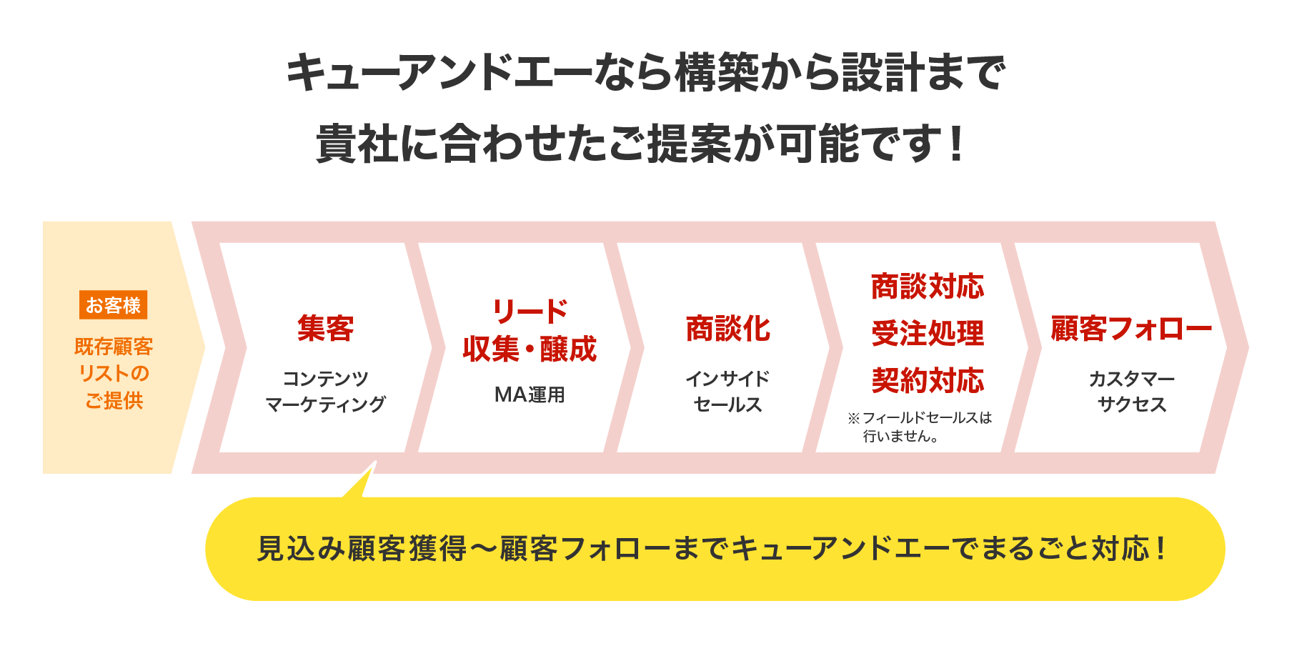 見込み顧客獲得~顧客フォローまでキューアンドエーでまるごと対応いたします。