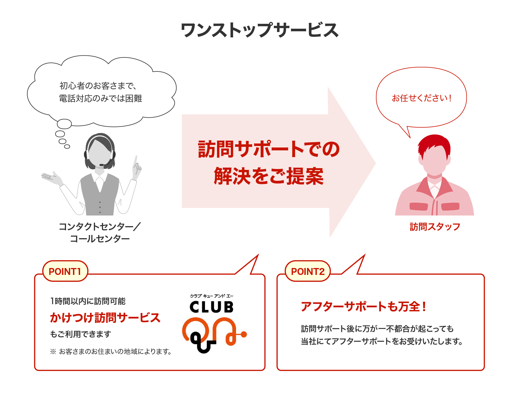 - 故障判断はお客さま宅の環境に左右されることがあり、オンサイト(訪問)サポートが効果的です