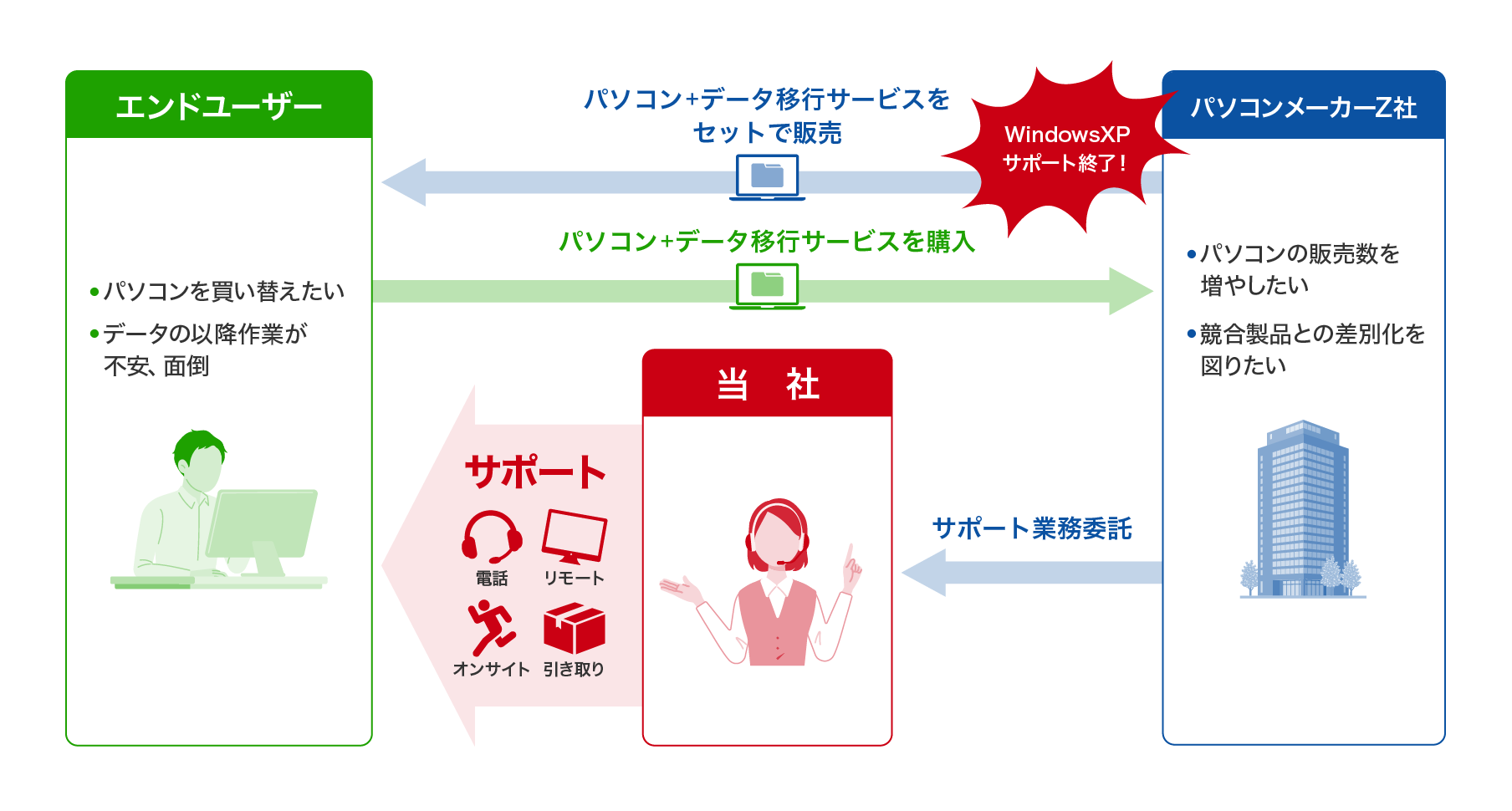 当社の「法人向けオンサイト(訪問)サポート」導入においては、設置設定の作業のみではなく、計画段階からオンサイト(訪問)サポートの“肝”を熟知したスタッフが常駐し、プロジェクトと本部の立ち上げに参画しました。作業に欠かせないサポートマニュアルや教育手法を確立し、案件をスケジュール通りに完了させるばかりか、当社スタッフの円滑な作業手順を見た顧客からR社に保守・運用の依頼が入るなど、新たな引き合いへとつながりました。