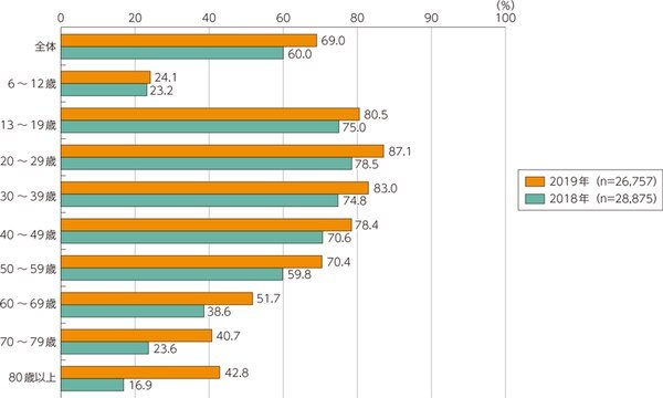 FacebookやInstagram、TwitterなどのSNSで企業アカウントを作成し、投稿を通じてフォロワーやいいね!を獲得するのがSNSマーケティングです。総務省の調査によると日本全体のSNS利用率は69%であり、40代50代で70%を超えるなど中高世代での利用も拡大しています。