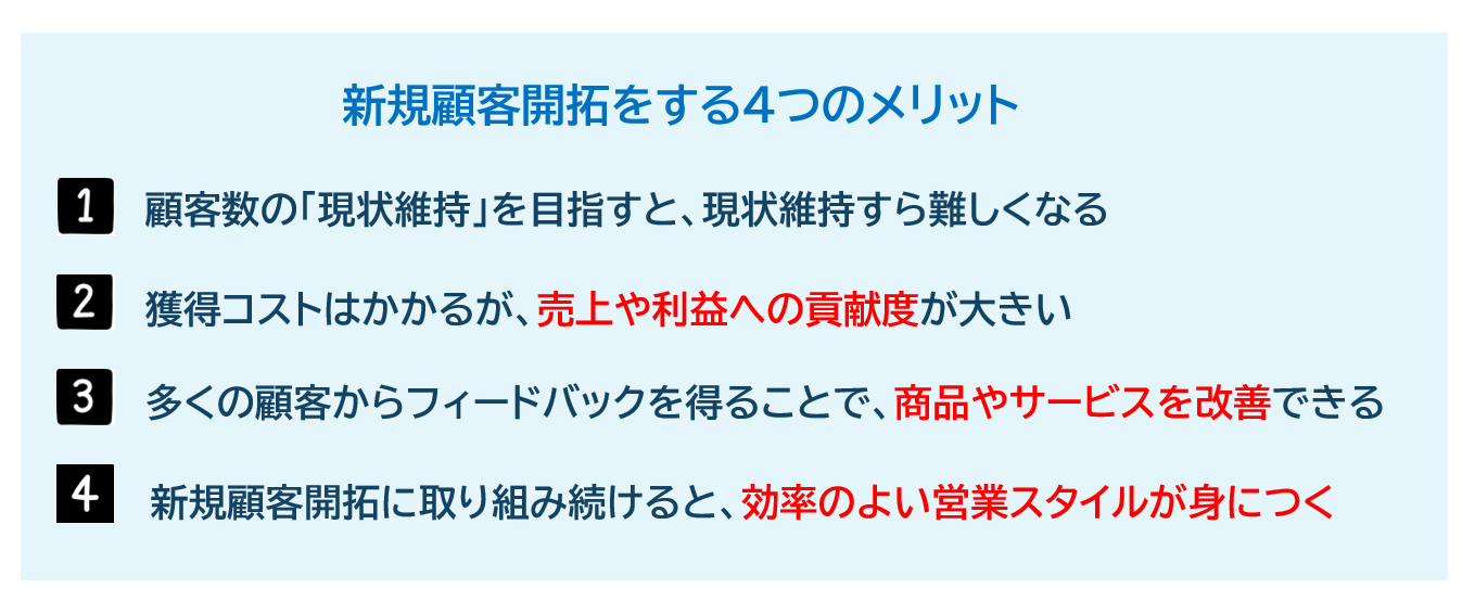 新規顧客を獲得するコストと、既存顧客を維持するコストの割合はよく「5:1」と言われています。新規顧客を獲得するのに10万円のコストがかかるとすれば、既存顧客を維持するのは2万円で済みます。既存顧客を維持する方が低コストで効率も良いので、新規顧客開拓が疎かになってしまう企業も少なくありません。しかし、皆さんが企業成長を目指していれば新規顧客開拓は絶対に欠かせない取り組みです。新規顧客獲得に取り組まないと売上や利益は次第に下がっていきます。新規顧客開拓をするメリットは、以下4つになります。