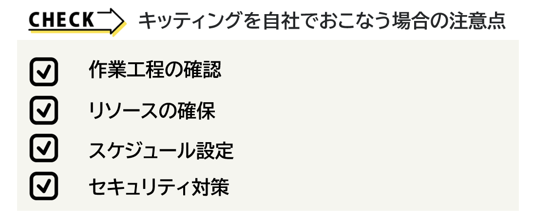 キッティングを自社でおこなう場合は、以下のポイントに注意しましょう。注意点を押さえて、キッティングの準備や実施を進めていきましょう。