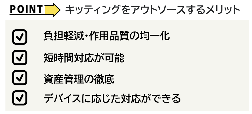 また、自社で手作業でキッティングを行うと、担当者によって作業の質がブレることもあります。アウトソーシングの場合、業者がツールを使って作業することが多く、品質を均一化できるのもメリットです。