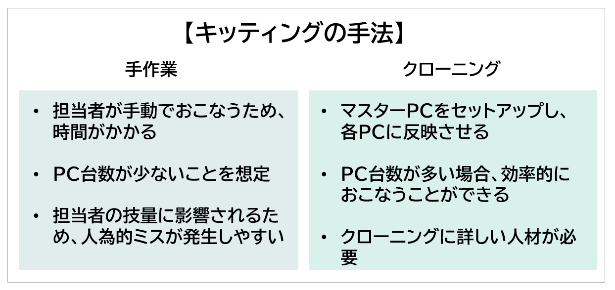 キッティングの手法は、手作業とクローニングという作業の2つに分けることができます。それぞれどのようにキッティングをおこなうのか、特徴を押さえていきましょう。