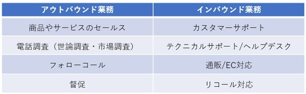 コールセンターは、電話を通じて顧客に商品やサービスを紹介したり、受注・成約に繋げる部門のことです。コールセンターの業務は、インバウンド業務(受電)とアウトバウンド業務(発信)に分かれており、目的によって業務内容が異なります。コールセンターの主な業務は次の通りです(参考:コールセンターが抱える課題と対応策をわかりやすく紹介!)