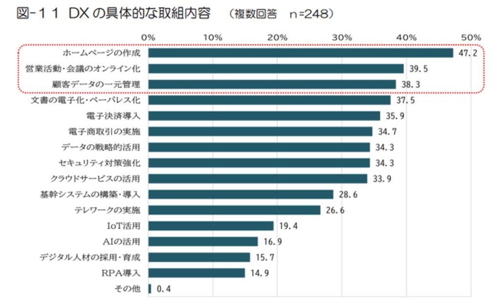 次に「中小企業のDX取り組み内容」を見ていきましょう。同調査のなかで「DX を既に推進・検討している」と回答した企業に対し、具体的なDXの取り組み内容について質問しています。回答でもっとも多かったのが、なんと「ホームページの作成(47.2%)」です。多くの中小企業では、未だにホームページを準備中であったり、活用方法を検討中の段階であることが分かります。