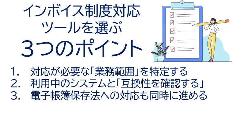 インボイス制度に対応するツールを選ぶ際、必ず押さえておくべきポイントがあります。次の3つのポイントを踏まえて、自社に適したツールを選びましょう。