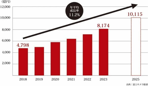 SaaSは参入社数が増加し急激に成長している市場です。株式会社富士キメラ総研の日本のSaaS市場の変遷と予測では、2018年のSaaSの市場規模は4,798億円、資金調達額は総額550億円を突破し、5年前の5倍以上の規模となりました。また、2025年のSaaS市場規模は10115億円と予測され、その年平均成長率は11.2%と大きく成長することが予想されています。