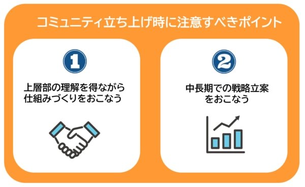 コミュニティの立ち上げ時には目的に沿った仕組みづくりを、上層部の理解を得ながら進めることが重要です。