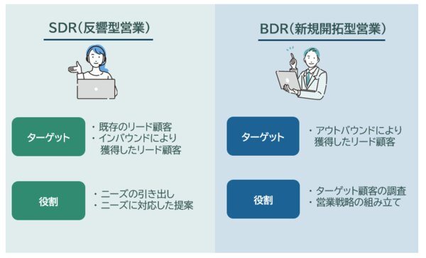 SDR(Sales Development Representative)は、既存の取引先やインバウンドで獲得したリード顧客を対象に営業活動をおこなう反響型営業です。