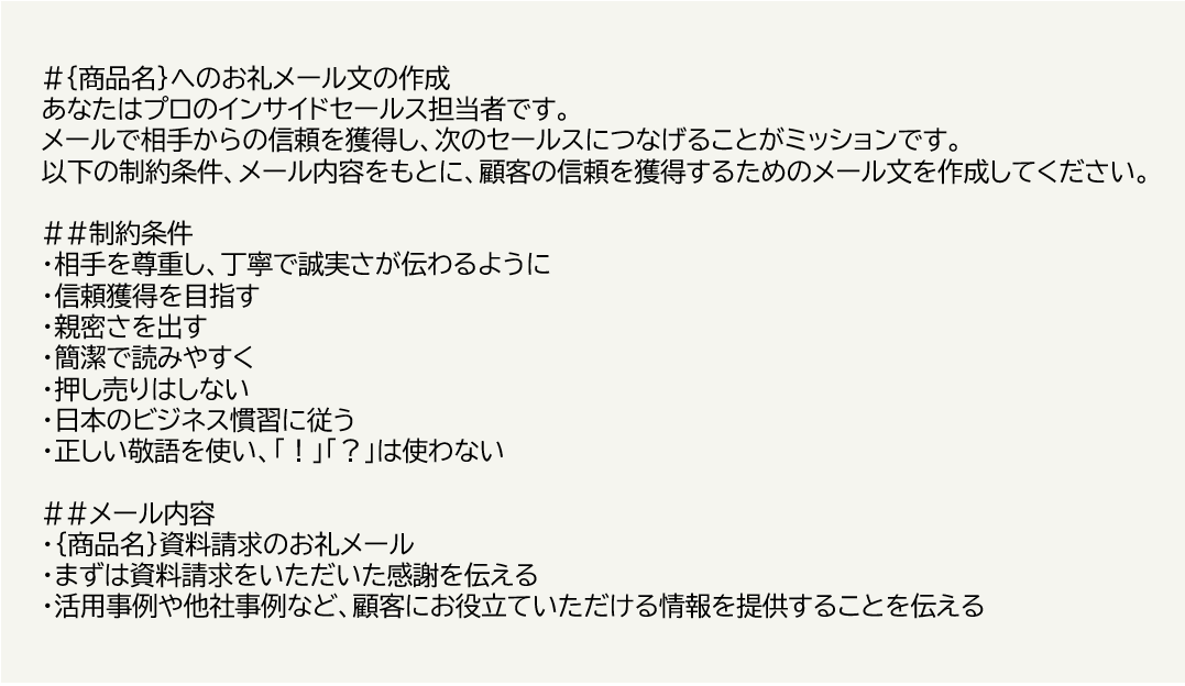 いかに適切なプロンプトを与えられるかがChatGPT活用における肝といえるでしょう。ここでは、インサイドセールスの業務におけるChatGPTのプロンプト例を紹介します。