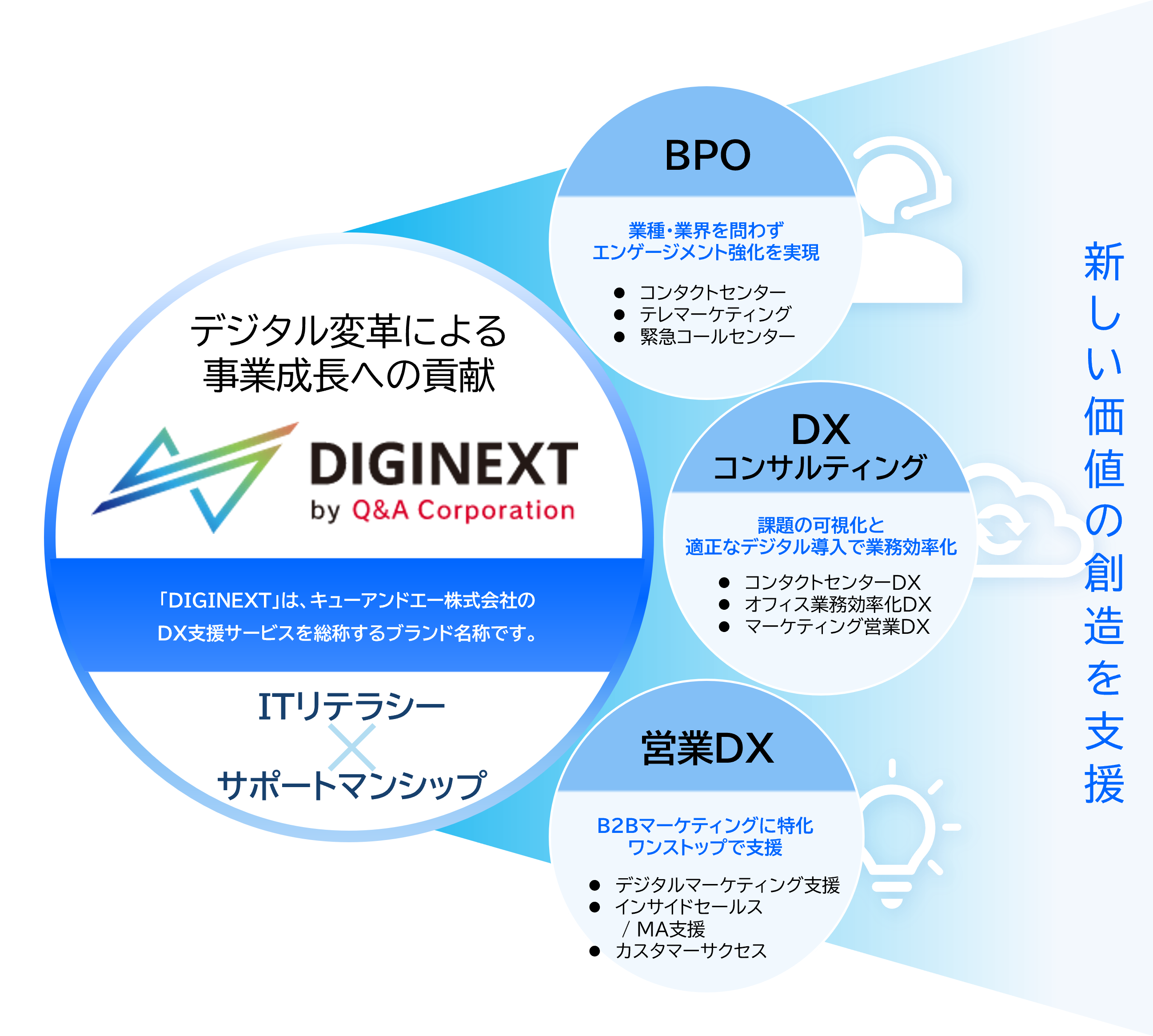 こうした課題に対してキューアンドエーは、業界・業態問わず、多くのIT支援を手掛けた実績と「サポートマンシップ※」を基に、このたび新ブランド「DIGINEXT」を立ち上げました。