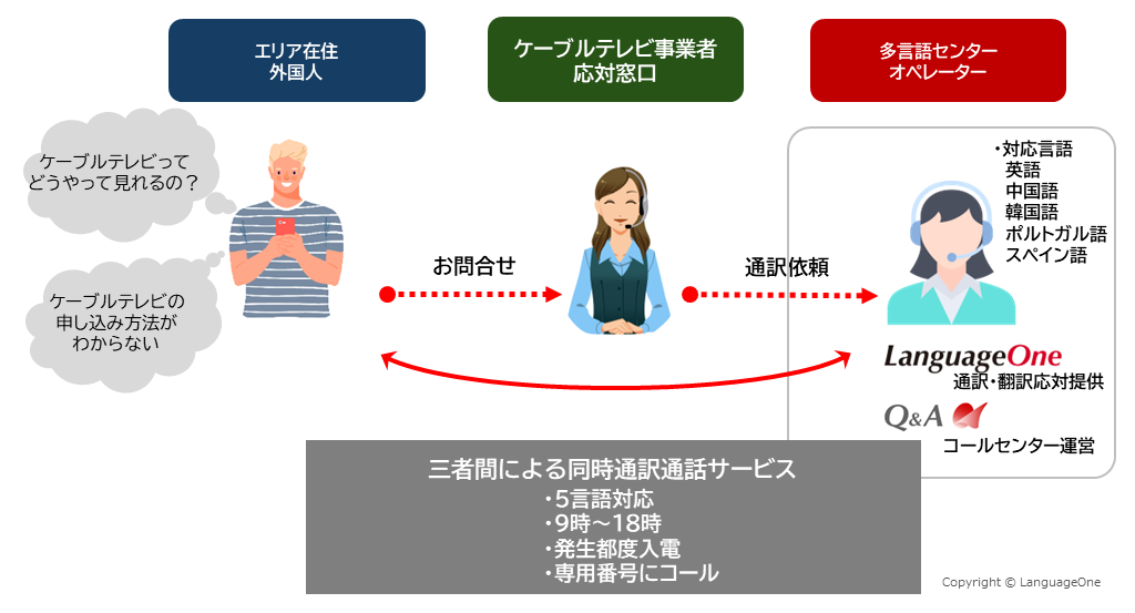 今回3社の協業にて提供する「多言語サービス」は、ケーブルテレビ事業者のテレビサービスやインターネットのサービスを利用するエリア在住の外国人を支援するサービスです。ケーブルテレビ事業者が提供する各種サービスの申し込みや利用方法などの問い合わせを、ランゲージワンの多言語オペレーターがカスタマー対応するオペレーターの間に入り、三者間による同時通訳通話で応対いたします。英語・中国語(北京語)・韓国語・ポルトガル語・スペイン語の5言語に対応しており、日本に在住する幅広い国籍のお客さまをカバーしています。