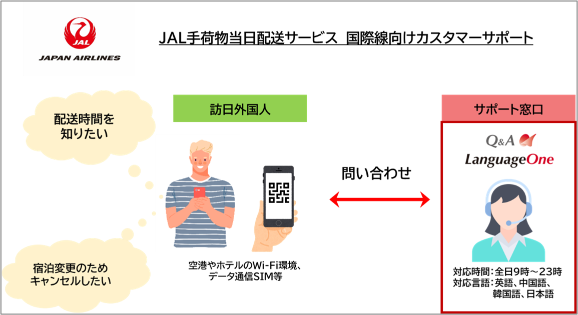 コンタクトセンター事業を展開するキューアンドエー株式会社(代表取締役社長:野村勇人、宮城本店:宮城県仙台市、東京本社:東京都渋谷区、以下、キューアンドエー)とキューアンドエーグループで多言語通訳ソリューションサービスを展開するランゲージワン株式会社(代表取締役社長:猪股武、本社:東京都渋谷区、以下、ランゲージワン)は、日本航空株式会社(本社:東京都品川区、代表取締役社長:鳥取三津子、以下JAL)が運営する「JAL手荷物当日配送サービス」の国際線利用者向けへのサービス拡大として、「Qlick LinQ(クリックリンク)」を活用した多言語カスタマーサポートの提供を開始いたしました。