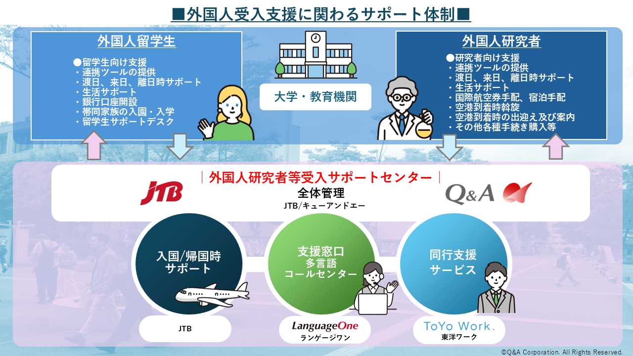 コンタクトセンター事業を展開するキューアンドエー株式会社(代表取締役社長:野村勇人、宮城本店:宮城県仙台市、以下、キューアンドエー)は、株式会社JTB(代表取締役社長執行役員:山北栄二郎、本社:東京都品川区、以下、JTB)との協業により、大学や教育機関に従事する外国人研究者・留学生等の国内での受け入れをサポートする「外国人研究者等受入サポートセンター(以下、本センターサービス)」の提供を2025年7月より開始しました。