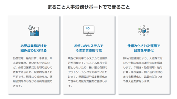 このような状況を受け、近年では業務単位で外部の専門リソースを活用し、運用の安定化を図る企業が増えています。法改正や制度改定に対応しながら業務を安定して継続させるためには、実務を支える運用支援が不可欠となっています。
