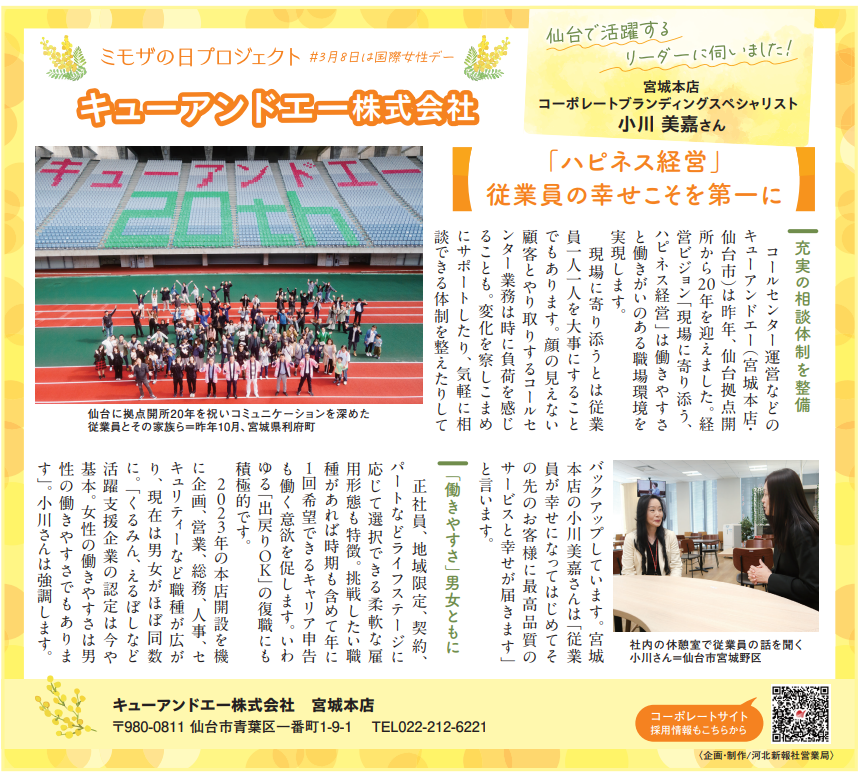 河北新報社より、当社宮城本店 コーポレートブランディングスペシャリストの小川美嘉が取材を受け、その内容が国際女性デー(2026年3月8日)発刊の「河北新報」特集【ミモザの日プロジェクト】内で紹介されました。