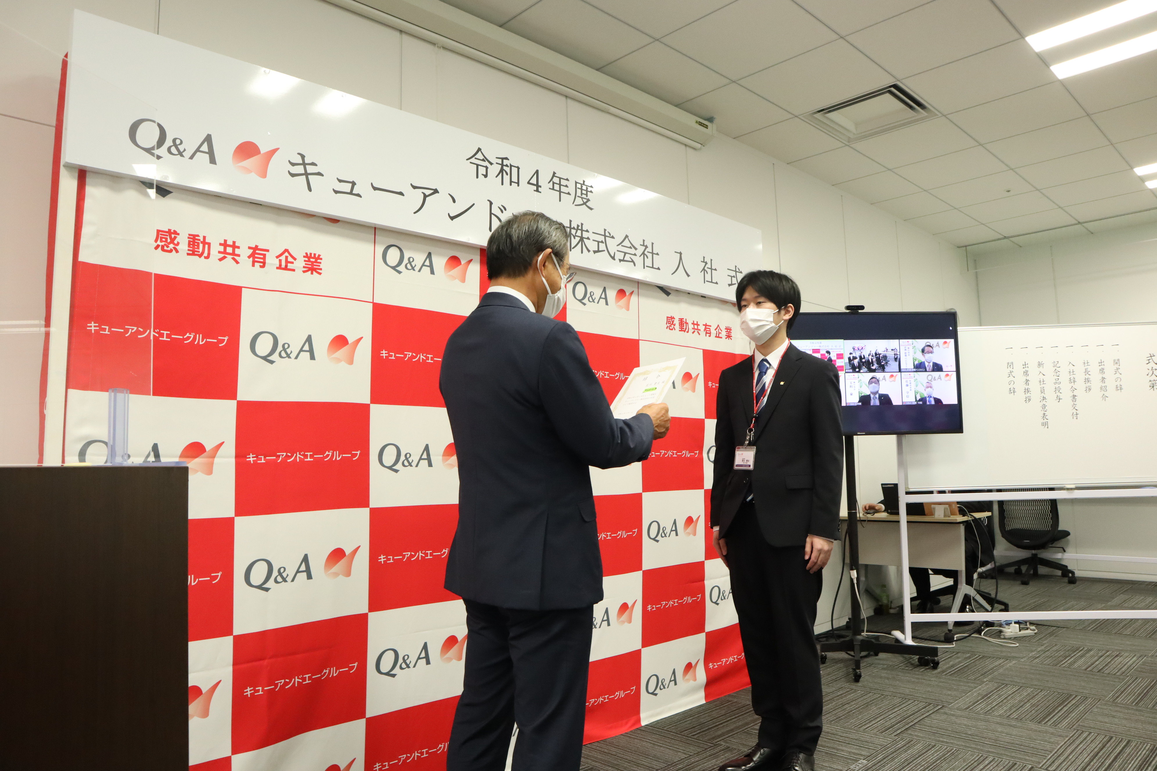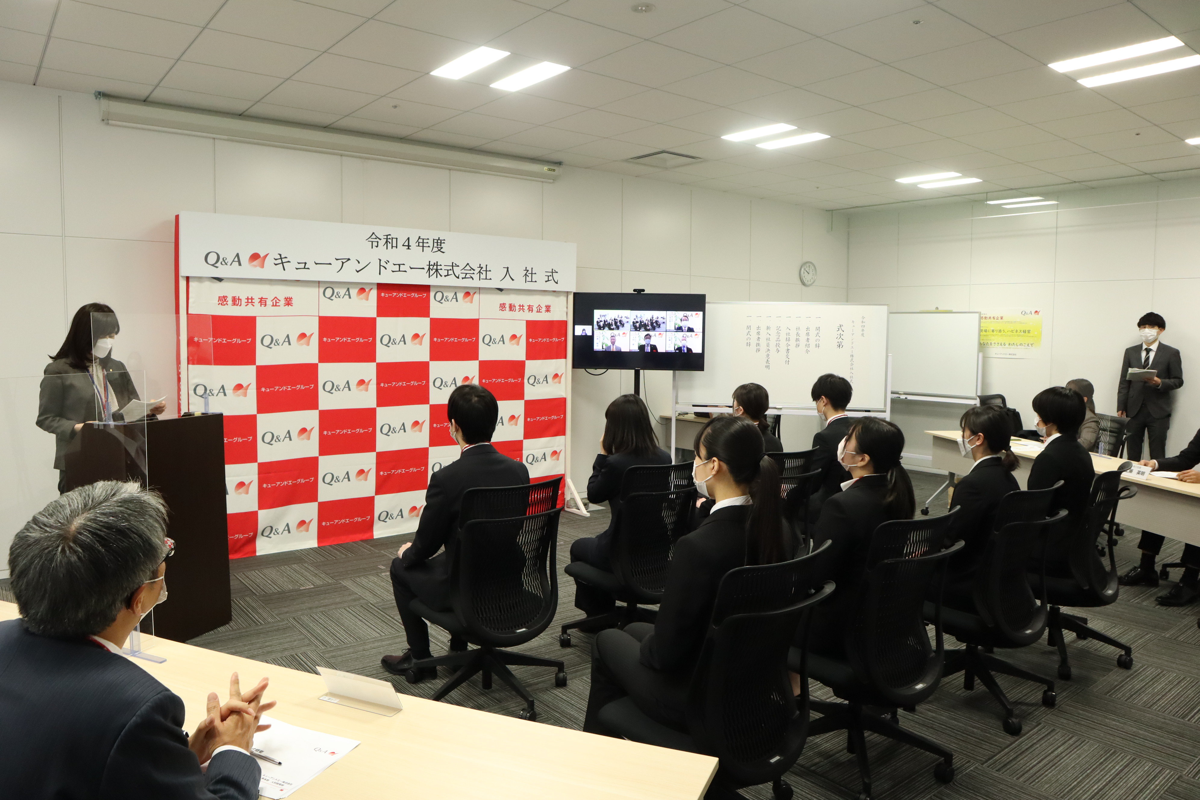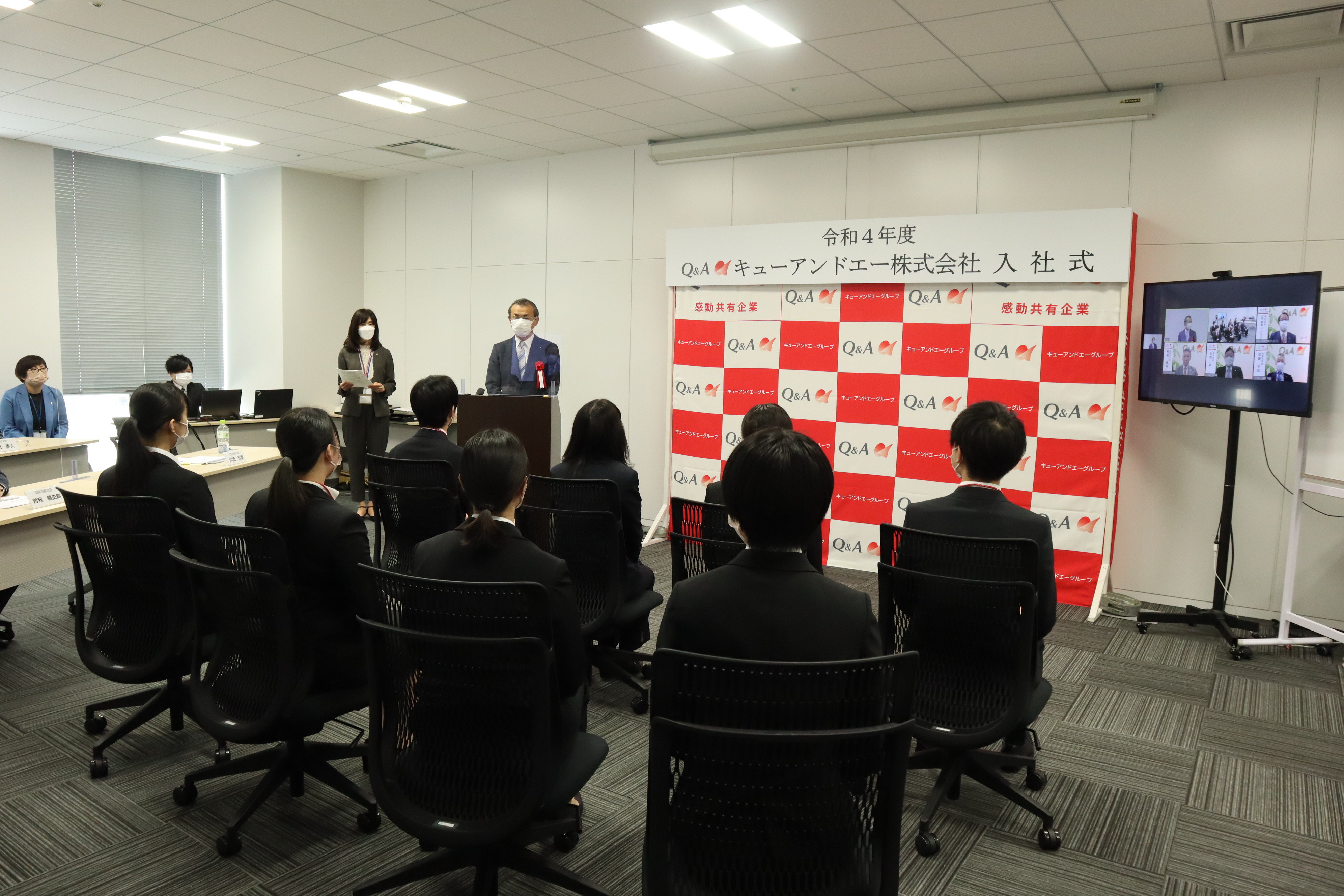 2022年4月1日(金)10時より、キューアンドエー株式会社は2022年度入社式を執りおこないました。本年度の新卒入社社員は、9名(総合職7名、アスリート職2名)です。