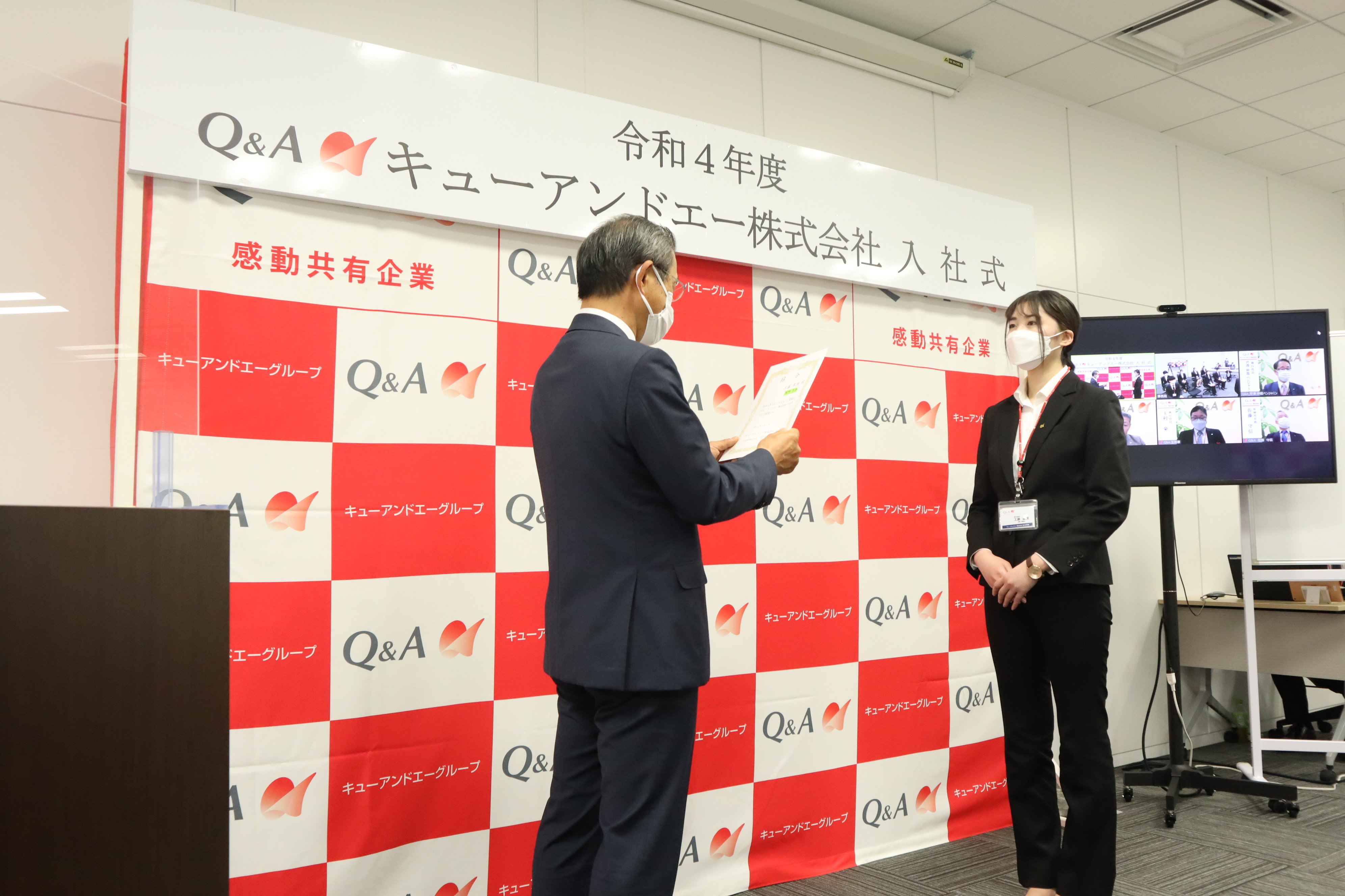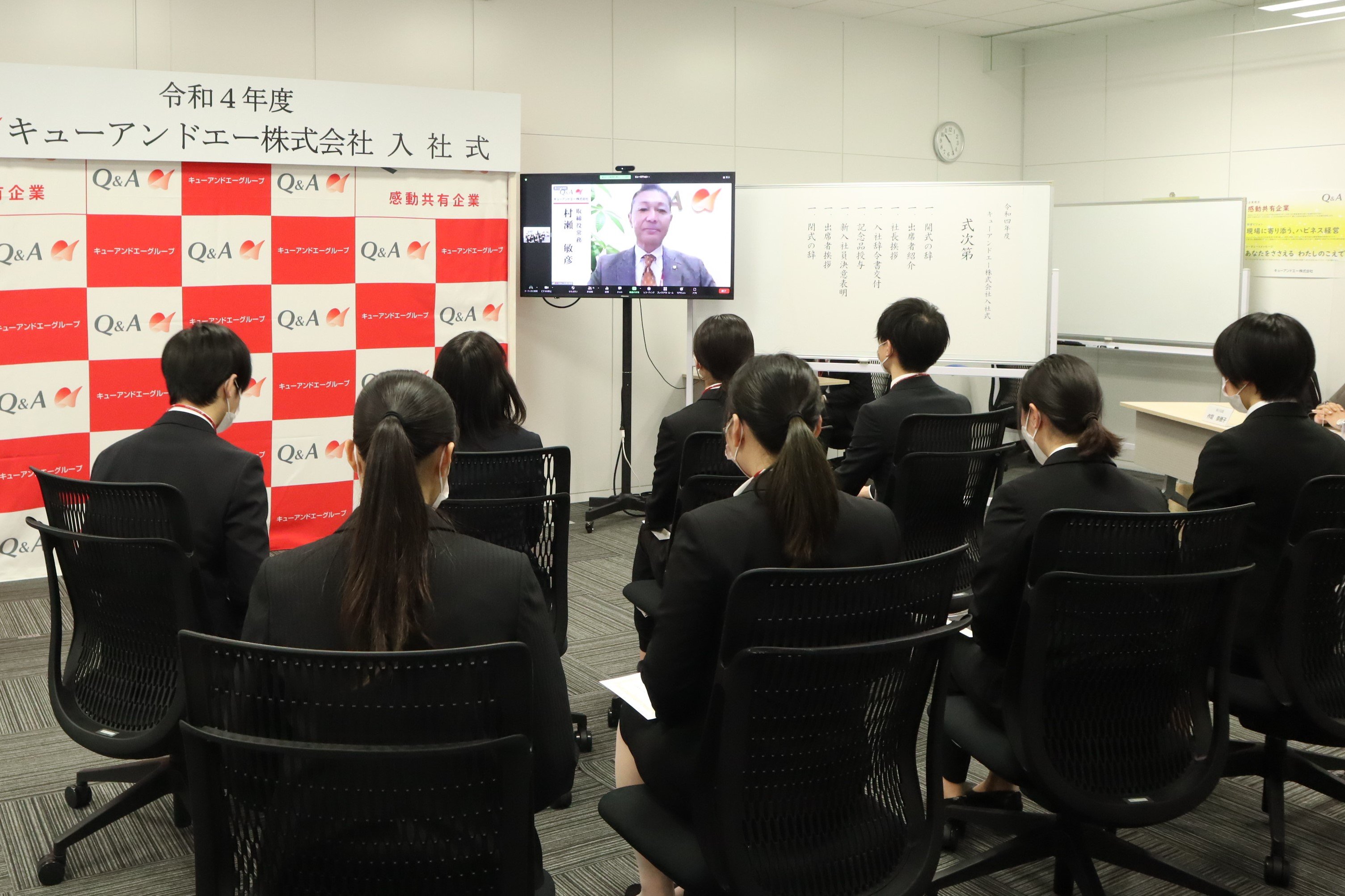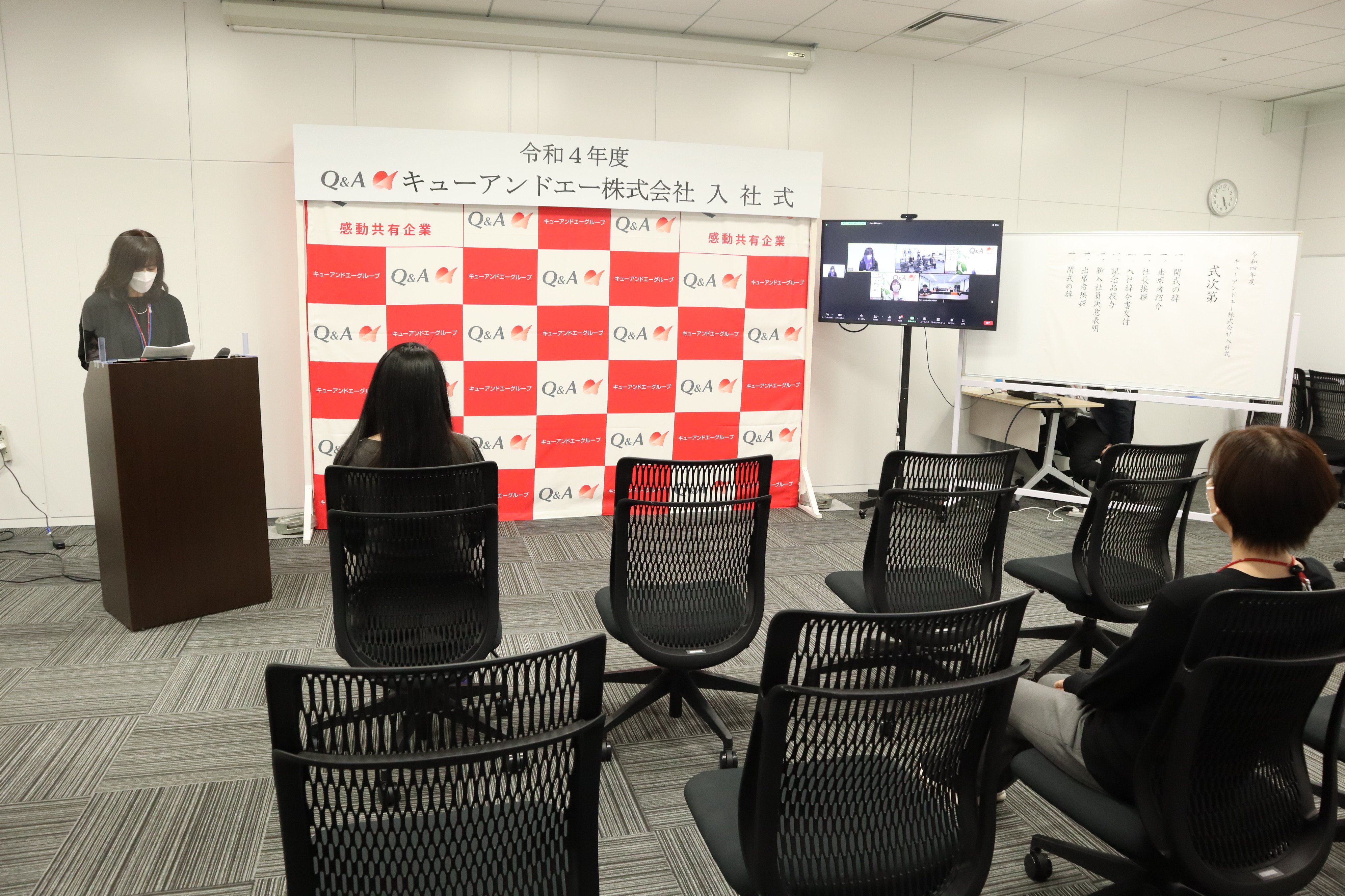 2022年4月1日(金)10時より、キューアンドエー株式会社は2022年度入社式を執りおこないました。本年度の新卒入社社員は、9名(総合職7名、アスリート職2名)です。