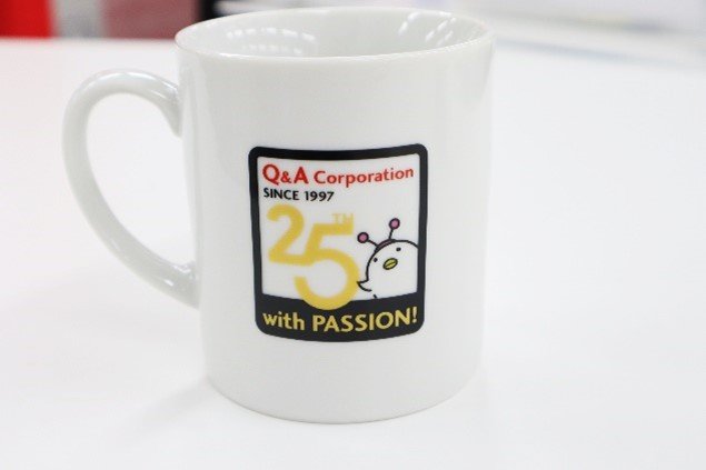 25周年を記念して制作した25周年記念マーク入りのマグカップを牛島社長へお渡しさせていただきました。牛島社長は「このカップで飲料を飲むたびに、みなさんの顔を思い浮かべたいと思います」と言ってくださいました。