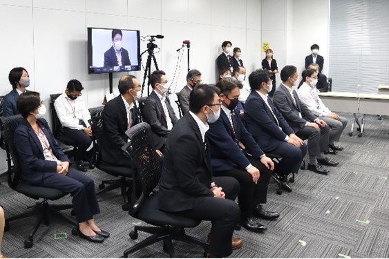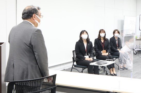 はじめに川田哲男社長から選手3名へ激励の言葉をいただき、続いてリガーレ仙台 遠藤健三部長よりご挨拶を賜りました。遠藤健三部長は加藤彩夏さん、鈴木音さん、鈴木美空さん、一人ひとりのプレースタイルや期待していることなどをお話ししてくれました。その後、選手3名の所属長である細谷謙吾健康管理センター長より仕事中のエピソードや3名の普段の様子を交えながら熱い応援メッセージをいただきました。