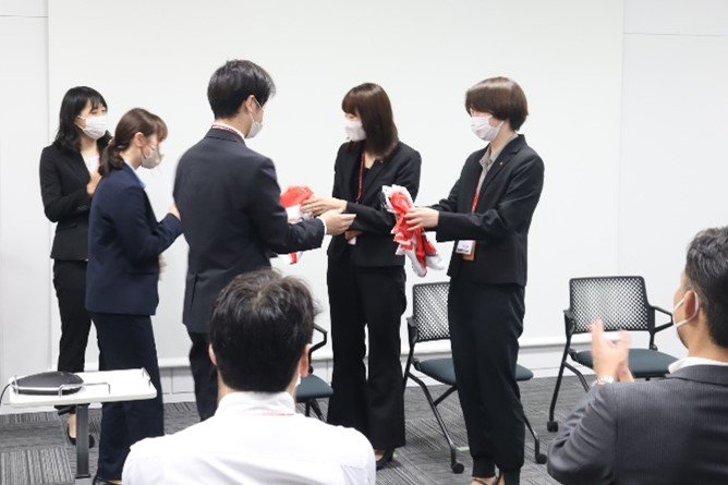 選手3名を応援するキューアンドエーの従業員の気持ちを何かで表現できないかなと考えて、試合会場で使える横断幕を22年度新入社員と健康管理センターのメンバーが3名に贈呈しました!