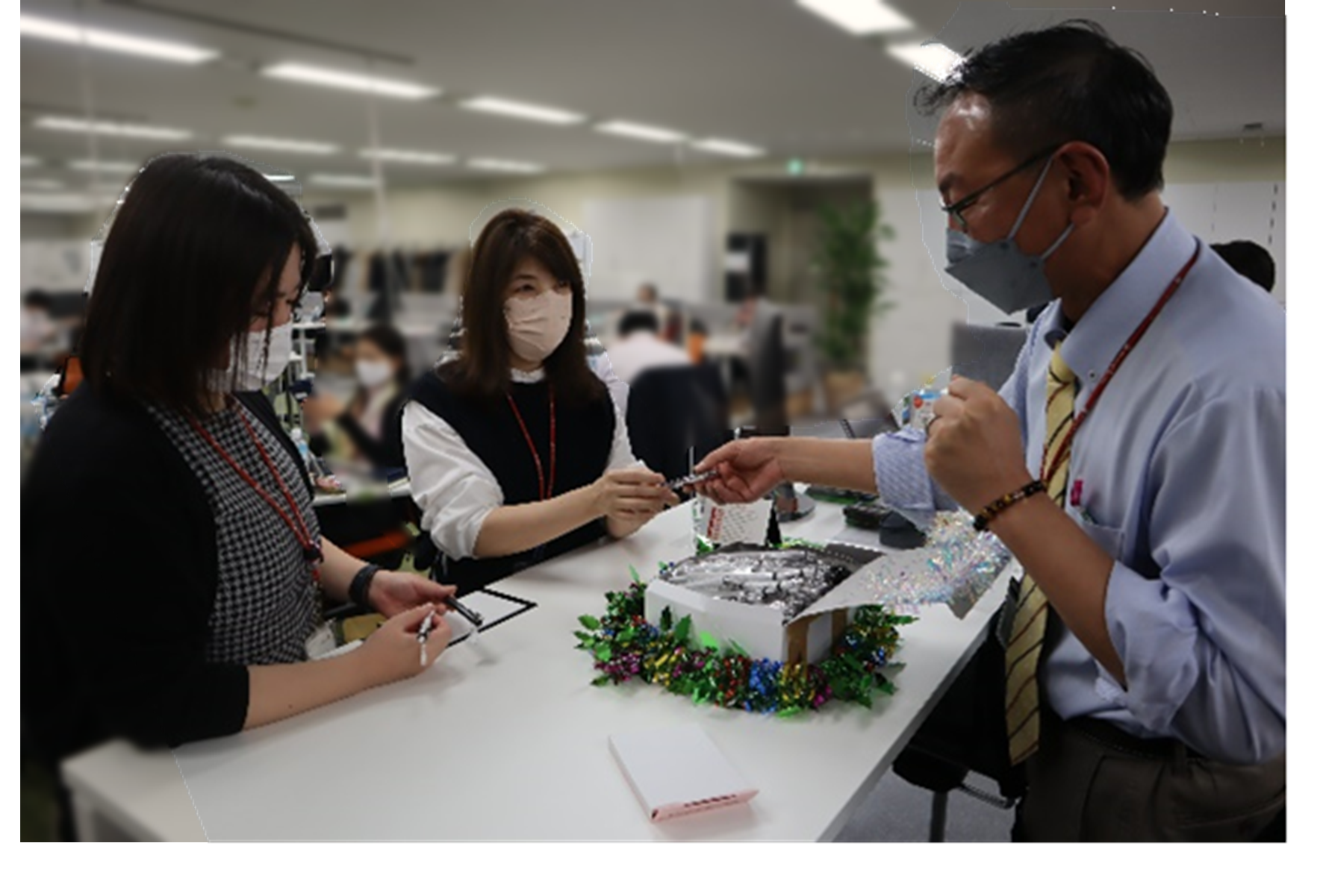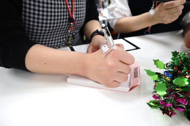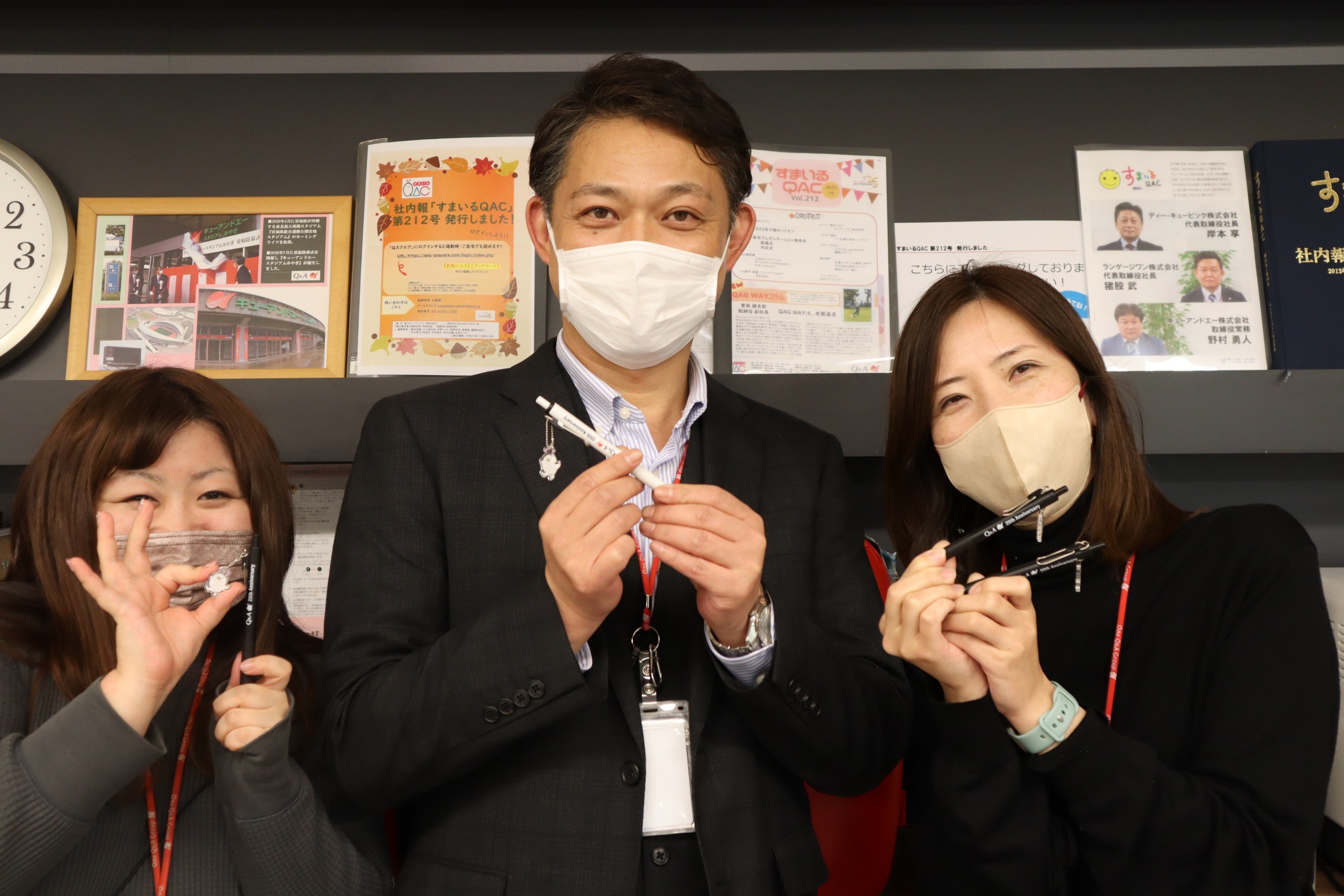 「どんなものを記念品にすべきかチーム内で様々な案がでました。コールセンターの業務をしている方が多いので日頃から使えるものがいいね!ということでボールペンにしました。オリジナルキャラクターを見て、仕事の合間に一息ついていただければと思います!従業員の皆さんから好評で嬉しいです。」