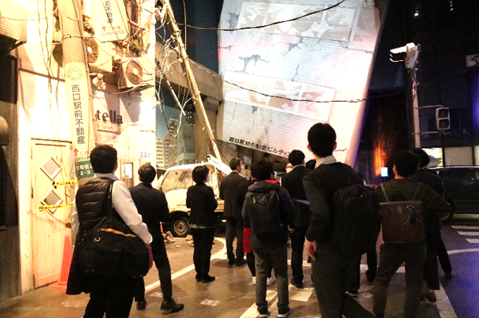 はじめに地震発生後 72時間(3日間)の生存力をつける、体験学習ツアー【東京直下72hTOUR】を体験しました。「東京直下72hTOUR」はマグニチュード7.3、最大震度7の首都直下地震の発生から避難までを体験し、タブレット端末を使ってクイズに答えながら生き抜く知恵を学びます。