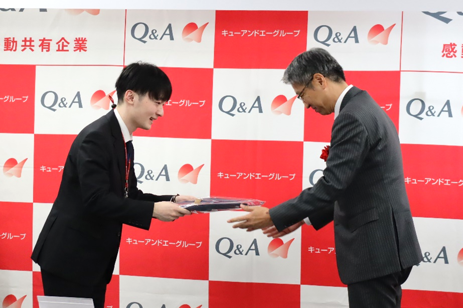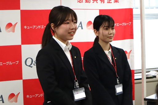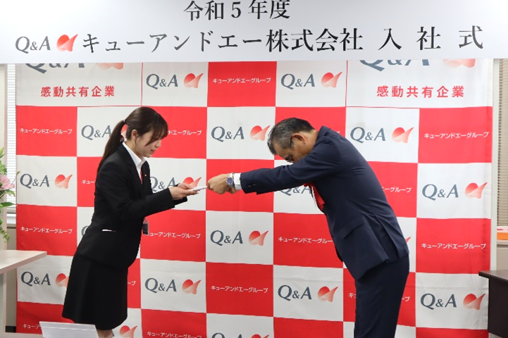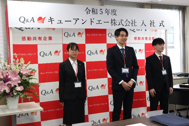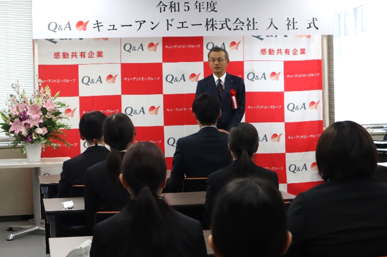 「社会人としての第一歩を進み始めました。皆さんはこれからの新しい時代を作っていく人財になります。遠慮なく気づいたことや感じたことは、会社へ率直に届けてください。キューアンドエーの大きな戦力としてお迎えしますので、よろしくお願いします!」とメッセージがありました。