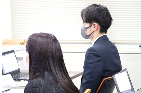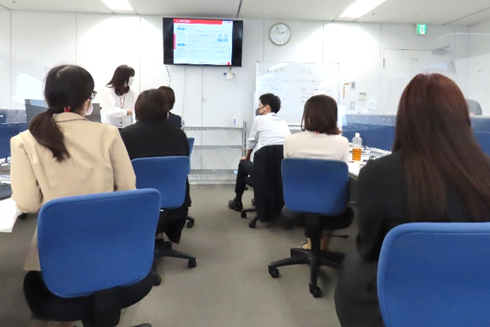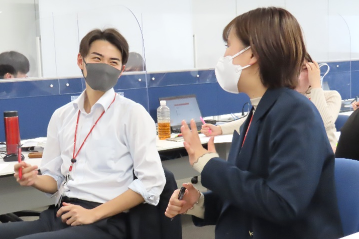 基本的な社会人としての立居振舞、身だしなみをお互いにチェックしながら学んでいます。また、「上司とタクシーや車に乗るとき、自分はどこに座るのか」「食事の際の座席はどこに誰が座るのか」など新入社員にとっては、初めて知ることばかりです。