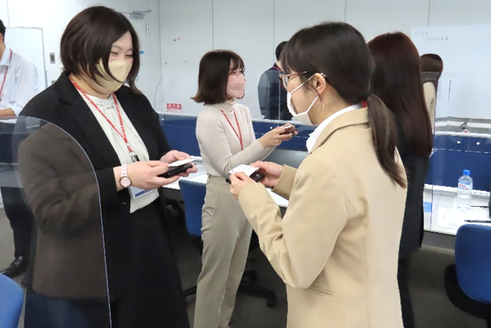 社会人となり、これからは名刺交換をする機会が多くなってきます。名刺交換のマナーを聞き、新入社員同士で実践をしました。