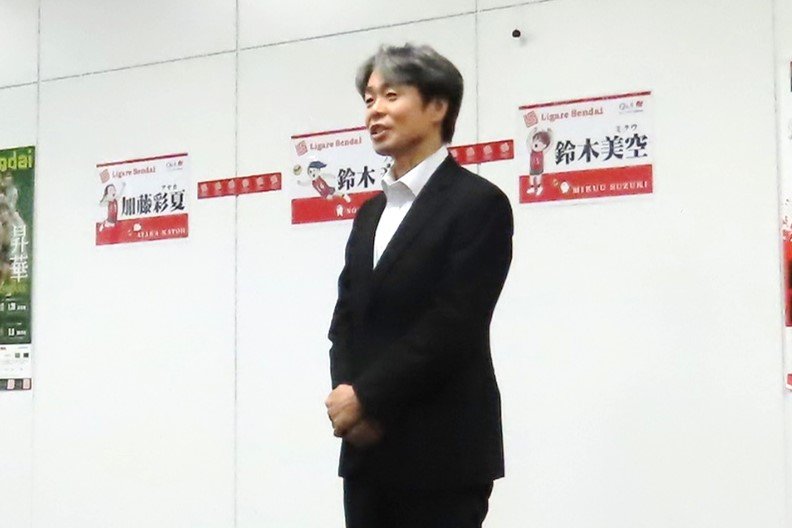 はじめに健康管理センター 細谷センター長から選手3名へ激励の言葉をいただき、続いてリガーレ仙台 村上部長、雜賀監督よりご挨拶を賜りました。その後、川田取締役より選手3名へプレゼントの贈呈と熱いメッセージをいただきました。