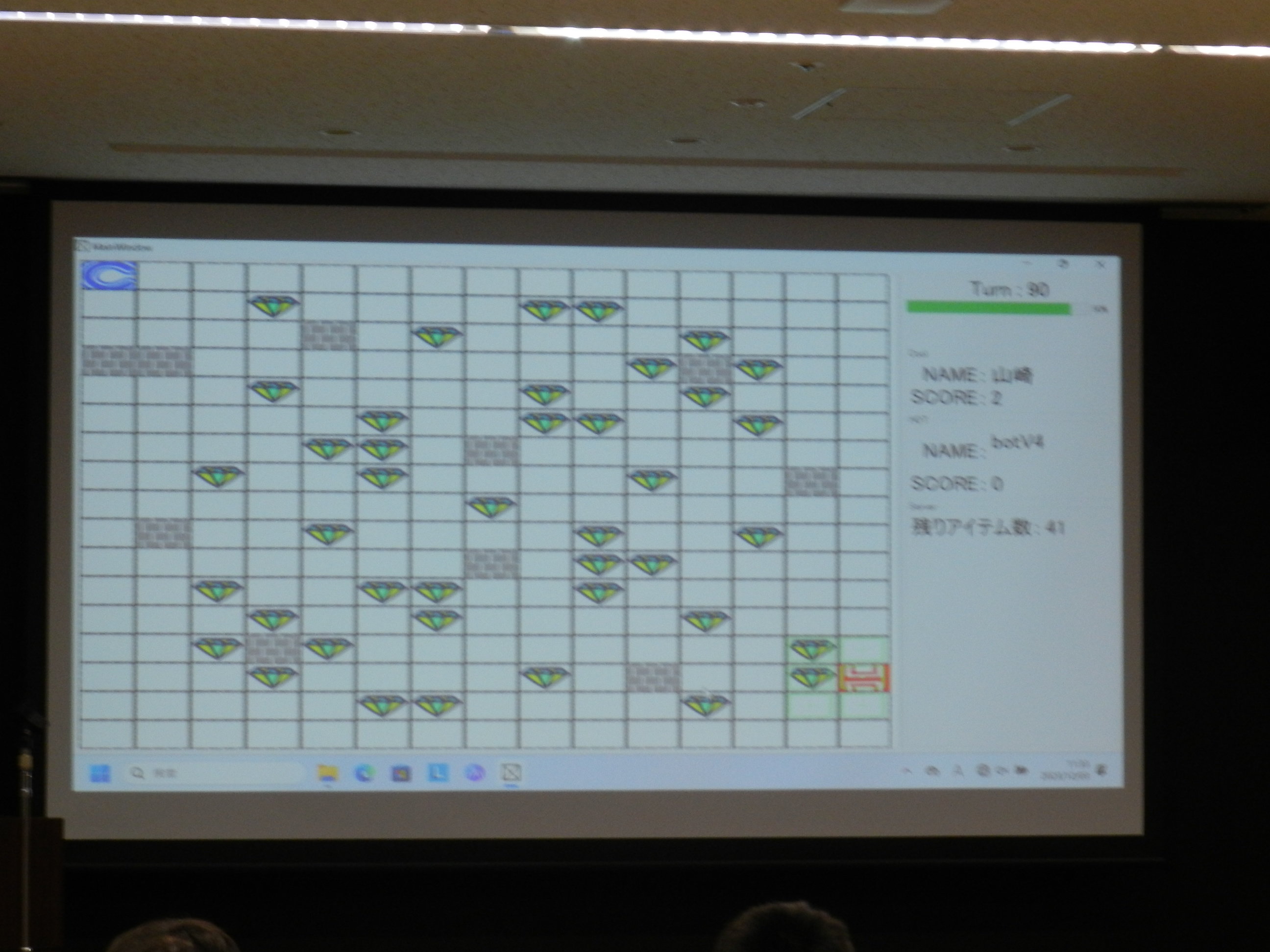 ・競技部門:各地の大会でおなじみの対戦型ゲームプラットフォーム(CHaser)を使用した競技です。碁盤目のフィールド上に参加者が作成したプログラム同士を戦わせるものです。ホット(H)とコール(C)の駒が、ダイヤモンドの駒を取りながら、点数を争うものです。またダイヤモンドの駒を取るとその駒はブロックとなり、その先は壁になります。この壁に囲まれ、抜け出せず途中でタイムアップになるケースもあります。このように幾つかの設定された条件を基に、それを回避するプログラムを作成し、時間内に多くのダイヤモンドの駒をとった方が勝ちになる競技です。と、言葉では単純なように見えますが、今回は13名の競技参加で、一人ひとり違うプログラムですので、これが観戦をすればするほど、初見者でも非常に面白く、また素人の観戦者にもプログラミングの難しさがわかるゲーム的な要素がある競技で対戦が始まると会場が熱くなっていました。