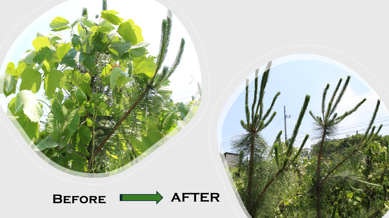 作業後、あたり一面すっきりとした景色に、参加者たちは充実感と達成感を共有することができました。と同時に、昨年の12月の作業から半年ですが、クズ蔓の成長が早く、地域内のマツにどれほどの蔓が巻き付いていたか、この作業を通じてよ~くわかりました。