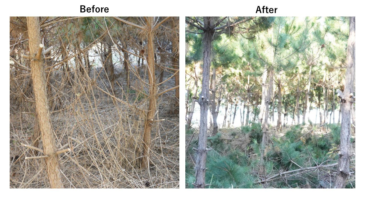 枝打ちは、クロマツ一本一本の状態を確認しながら、幹の下部にある不要な枝を丁寧に切り落としていく作業です。慣れない作業に最初は戸惑いながらも、協力しながら取り組みました。