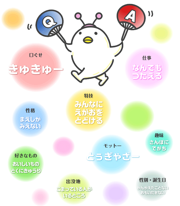 2013年7月、キューアンドエーグループキャラクターを社内公募し、投票の結果選ばれた当社グループのマスコット(愛称:Q助(きゅーすけ))です。