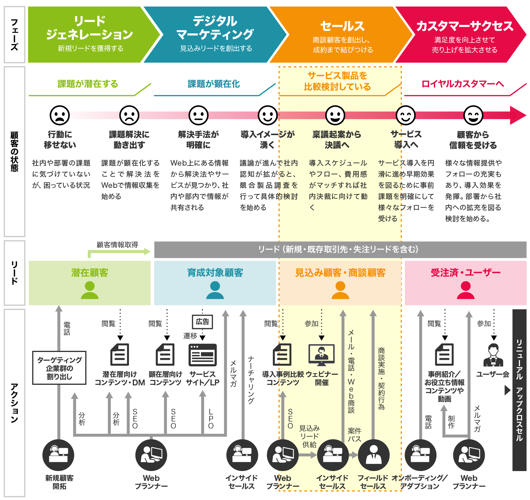 電話、メール、Webコミュニケーションを活用して法人顧客の育成(ナーチャリング)や商談機会の創出から受注までのプロセスを実行支援いたします