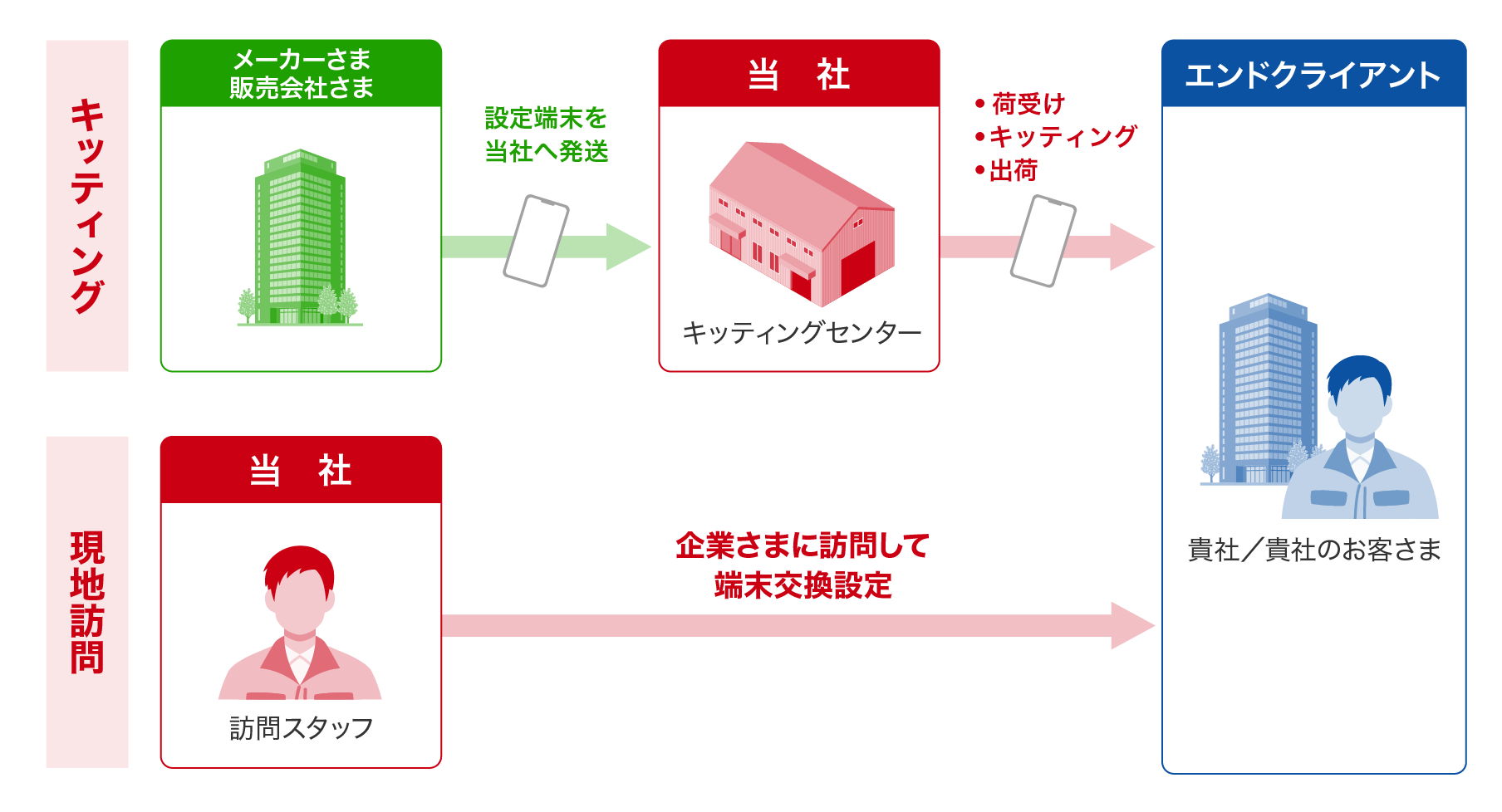 全国約700名のサポートスタッフがオフィスに訪問し、さまざまなテクニカルサポートを提供いたします。テクニカルスキルのみならず、ヒューマンスキルの高いサポートスタッフが貴社お客さまの満足度向上を支えます。現地導入だけでなく、キッティング・配送も承っております。